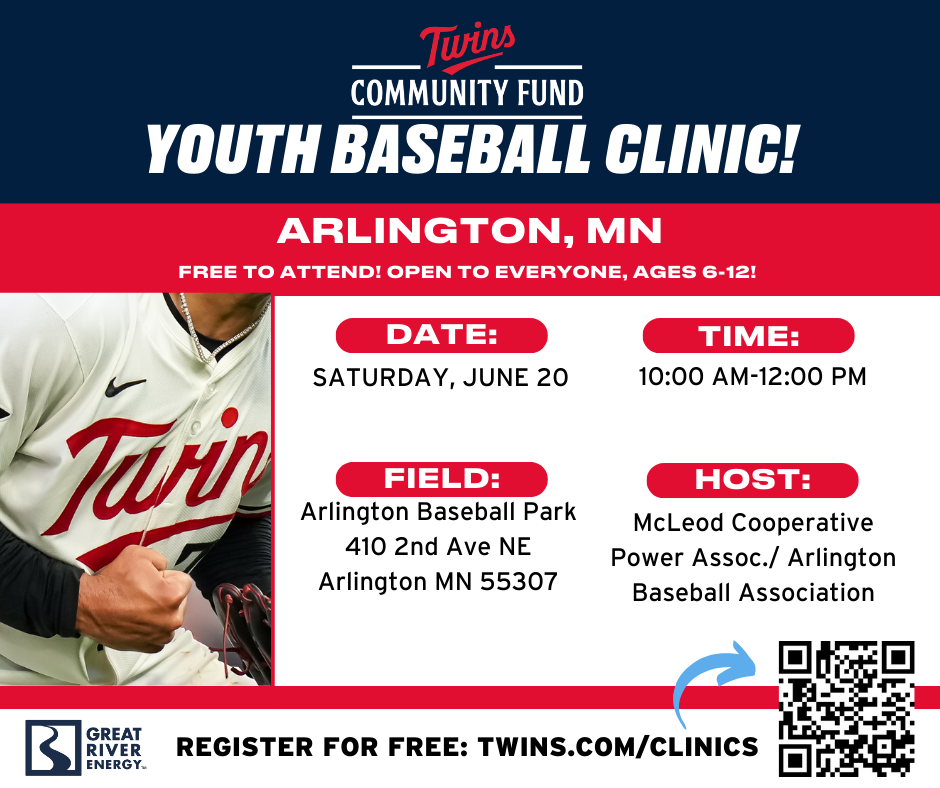 We’re proud to be a host for one of the Minnesota Twins Youth Baseball Clinics. These clinics are free to attend for ages 6-12 and focus on skill development in collaboration with the Twins and the Arlington A’s. This year’s clinic will be held on Saturday, June 20th, starting at 10 AM. Register using the QR code below.