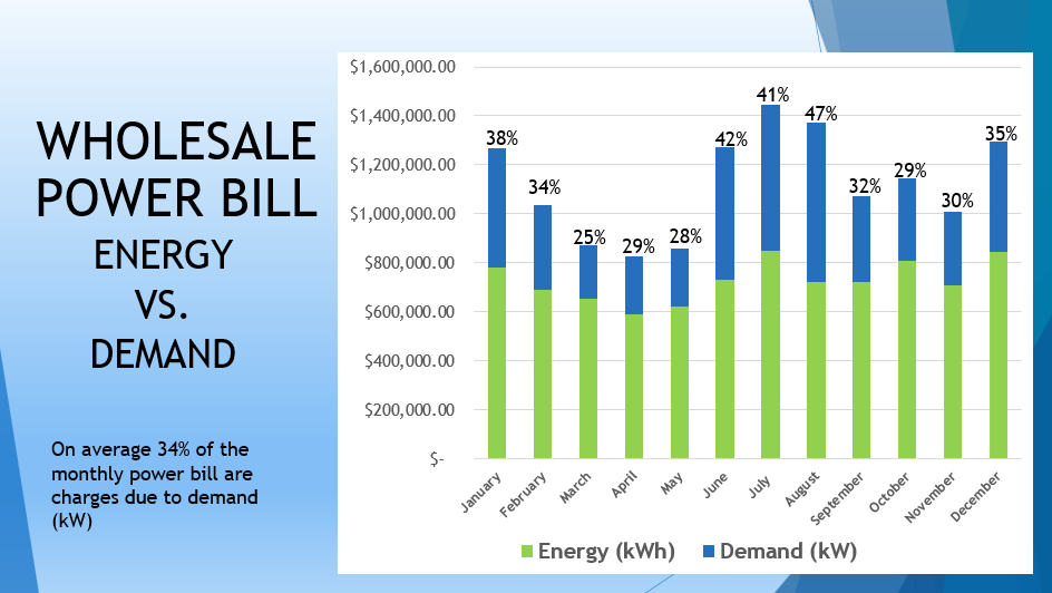 Demand charges account for roughly 25–30% of MCPA’s monthly wholesale power bill from Great River Energy. Here’s another way to look at it: